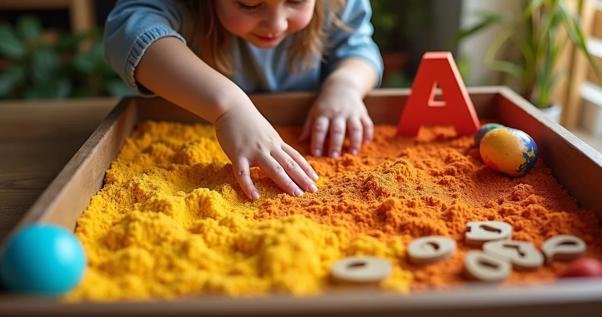 O Toque da Aprendizagem: Use texturas para que a criança sinta a letra. Uma caixa com areia, fubá ou até mesmo um prato com farinha no fogão (com supervisão!) permite que ela trace o ‘A’ com o dedo. É uma experiência sensorial que fixa o aprendizado.