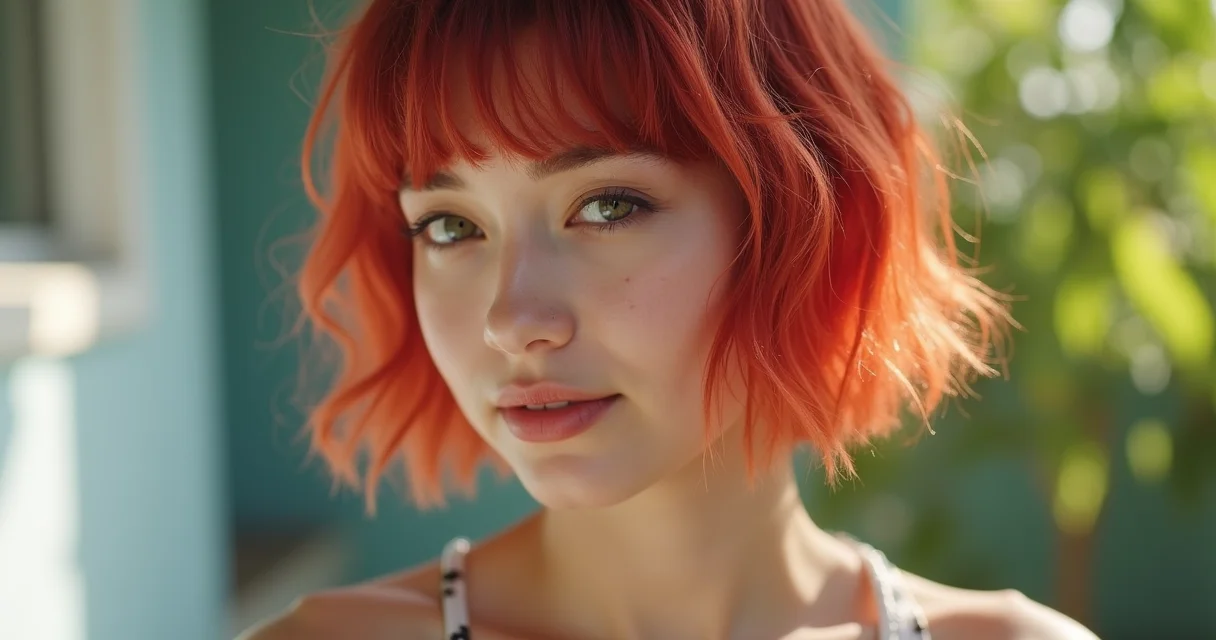 Detalhe de um Flipped Bob com as pontas viradas para fora, em um cabelo ruivo vibrante, com luzes direcionadas destacando o movimento.