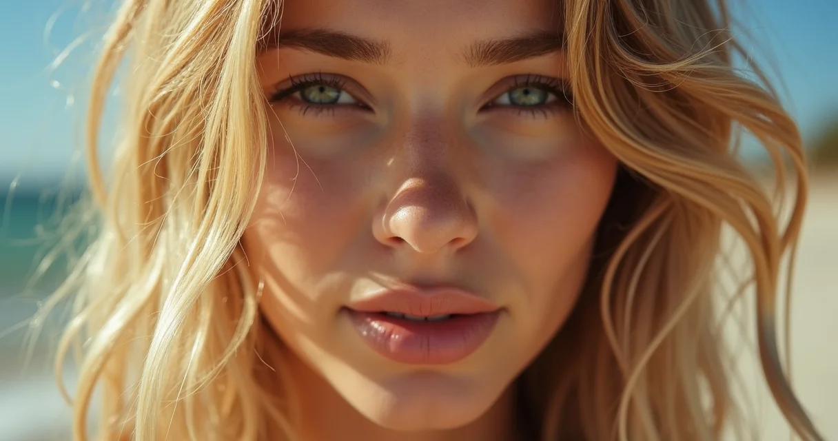 Cabelo loiro dourado com ondas naturais, iluminado por luz solar direta, realçando o brilho e a tonalidade quente e vibrante.