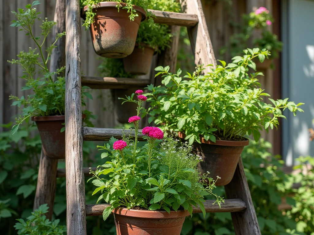 Dica Prática: Para um visual ainda mais alegre, pinte a escada com cores vibrantes que combinem com as flores! Use tinta resistente ao sol e à umidade para garantir que sua horta vertical colorida dure por muito tempo.