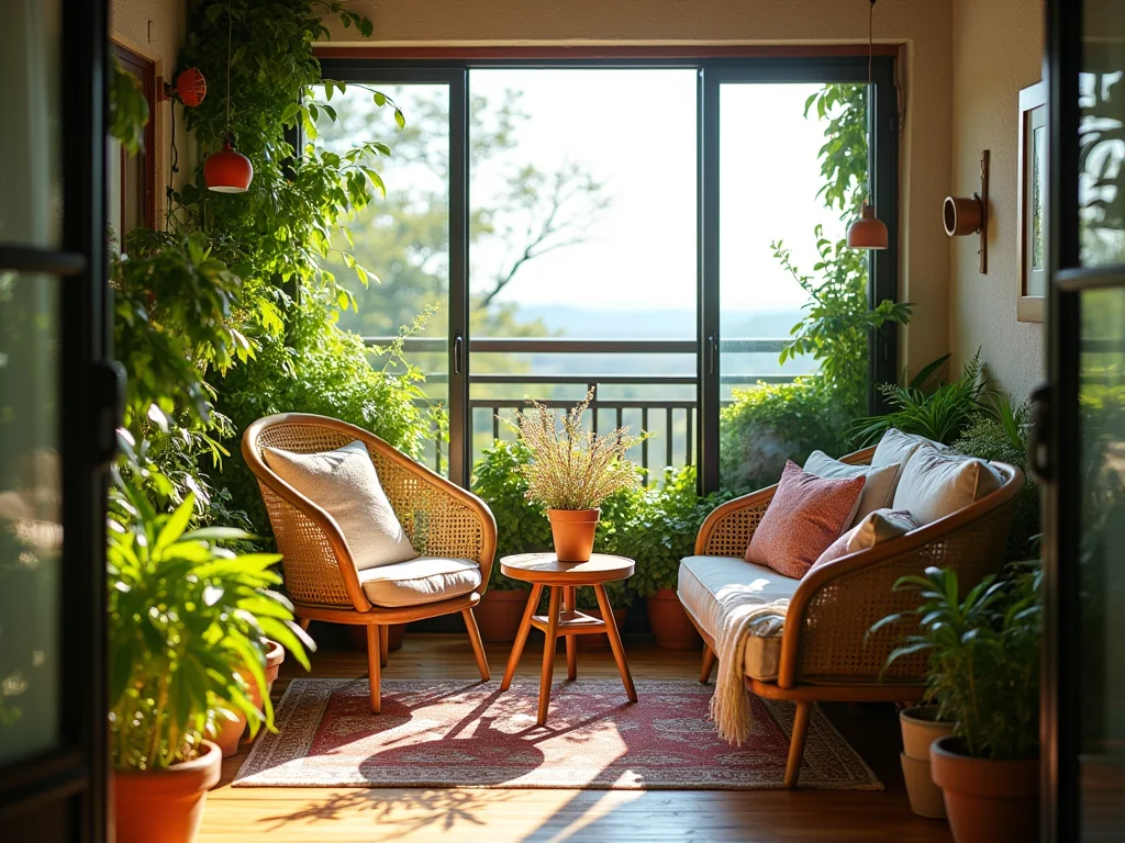 Dica Prática: Se sua varanda é pequena, use almofadas coloridas e um tapete com estampa vibrante para trazer a sensação de amplitude e alegria do estilo boho sem sobrecarregar o espaço.