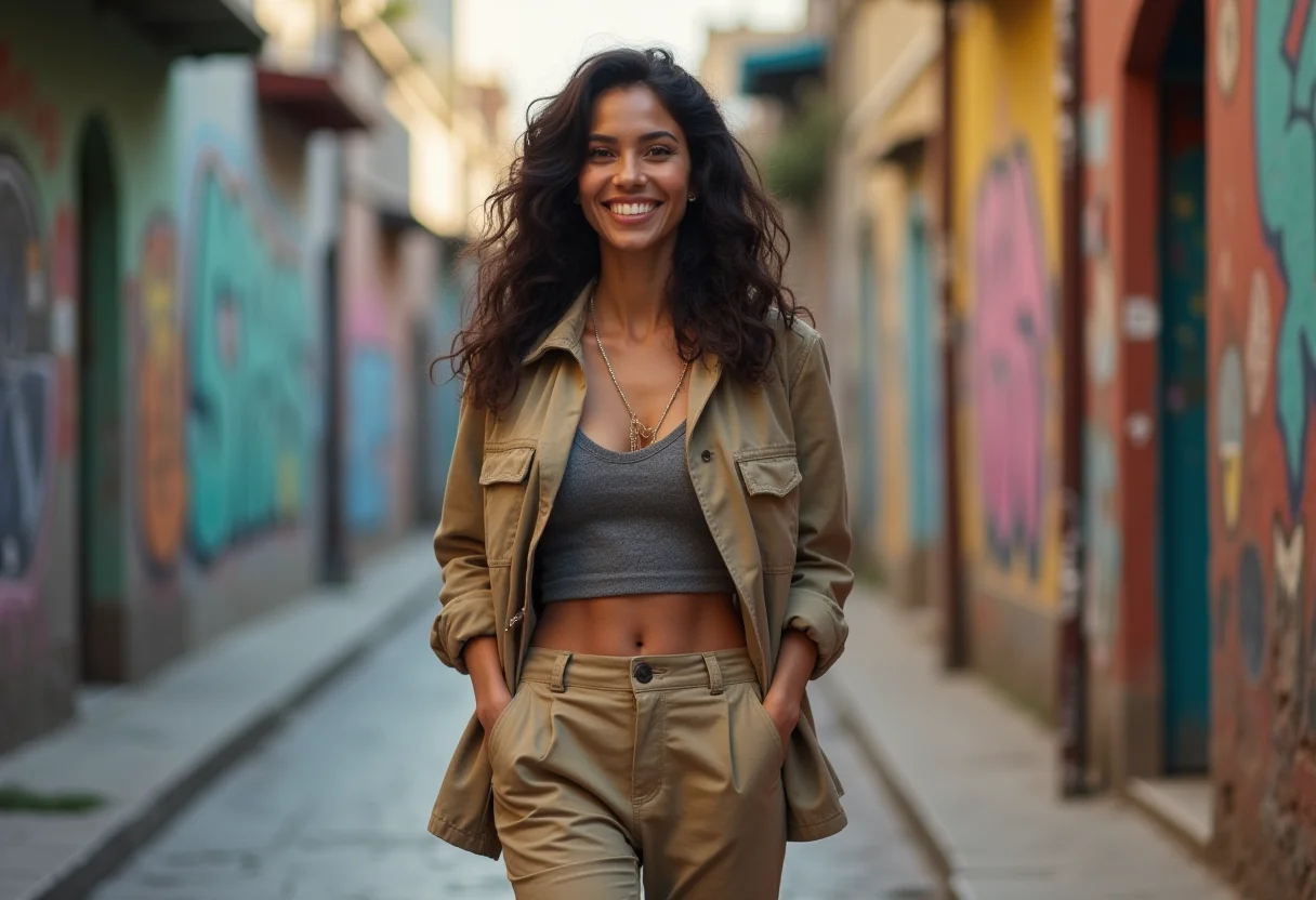 Para um visual mais aventureiro e moderno, a calça de sarja verde oliva é perfeita. Combine-a com uma camiseta estampada (com temas urbanos ou de natureza) e uma bota de couro. Nos dias mais frios, um casaco de sarja ou um jaqueta bomber complementam o look. Dica de expert: Escolha uma bota de couro de boa qualidade, que além de estilo, ofereça conforto e durabilidade. Vamos combinar, uma bota bem cuidada faz toda a diferença!