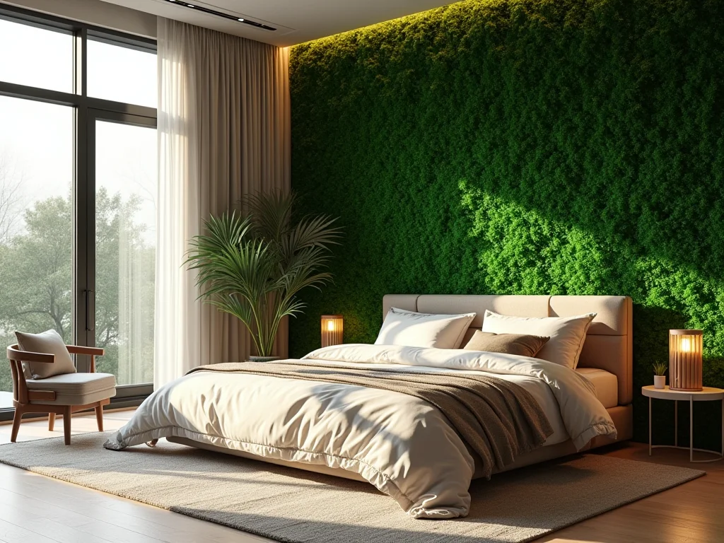 Além de deixar tudo lindo, uma parede verde ajuda a purificar o ar, sabia? É como ter um filtro natural trabalhando 24 horas por dia. E o efeito visual é espetacular, transforma totalmente a atmosfera do quarto, dando um toque de sofisticação e aconchego. Vale muito a pena investir nesse detalhe.